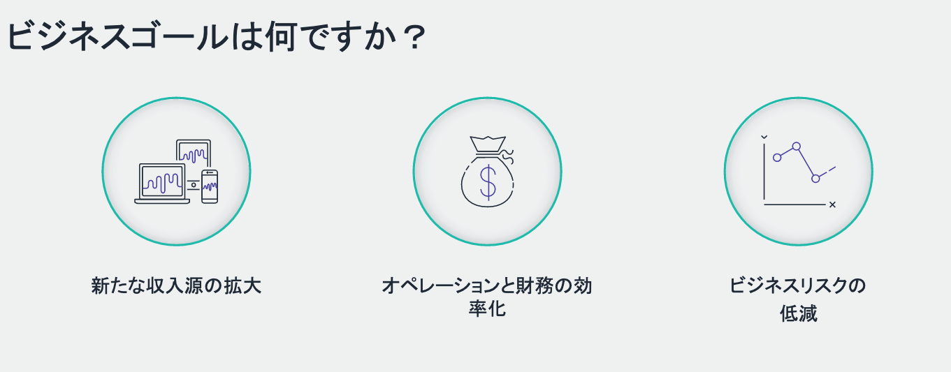 AI/ML サービスを検討する前に重要なことがあります。AI/ML サービスを使って達成したいビジネスゴールは何でしょうか?既存のサービスに組み込んで新たな収入源を作ったり、システムを維持するためのオペレーションや財務の効率化、ビジネスリスクの低減など様々なゴールがあるかと思います。