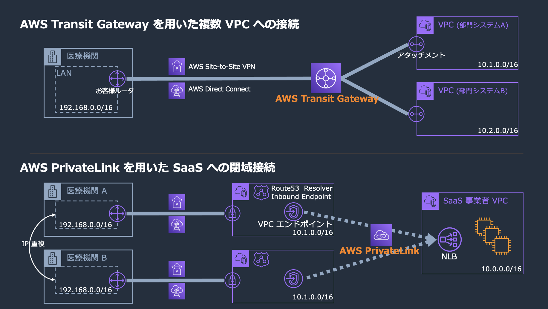 マルチテナント SaaS 型サービス事業者の視点からネットワークを考えると、複数の医療機関と VPN 接続が必要となるため、 セキュリティ観点の課題や IP アドレス範囲の重複の課題が考えられます。