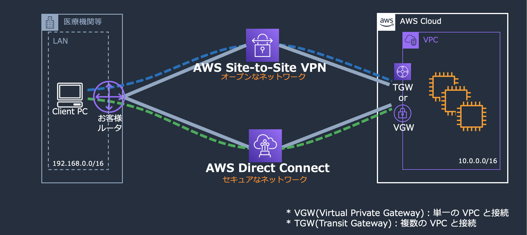 AWS Site-to-Site VPN は、AWS のマネージド VPN サービスの 1 つであり、クラウドとオンプレミスのネットワークを IPsec を用いて安全かつ暗号化された接続で結ぶためのサービスです。インターネット回線とIPsec 対応ルーター、固定 Public IP があれば、容易に環境構築ができスモールスタートで始められる点がメリットです (プライベート証明書による認証の場合、非固定 Public IP にも対応可能)。Site-to-Site VPN であれば、オンプレミスのネットワークと VPC 間でのセキュアな通信を確立し、プライベート IP アドレス同士で通信することも可能です。医療機関等のオンプレミス側でセットアップする必要のあるカスタマーゲートウェイデバイスの要件はドキュメントから参照できます。AWS Site-to-Site VPN に関する解説は、 [AWS BlackBelt Online Seminar] AWS Site-to-Site VPN (動画はこちら)から確認できます。