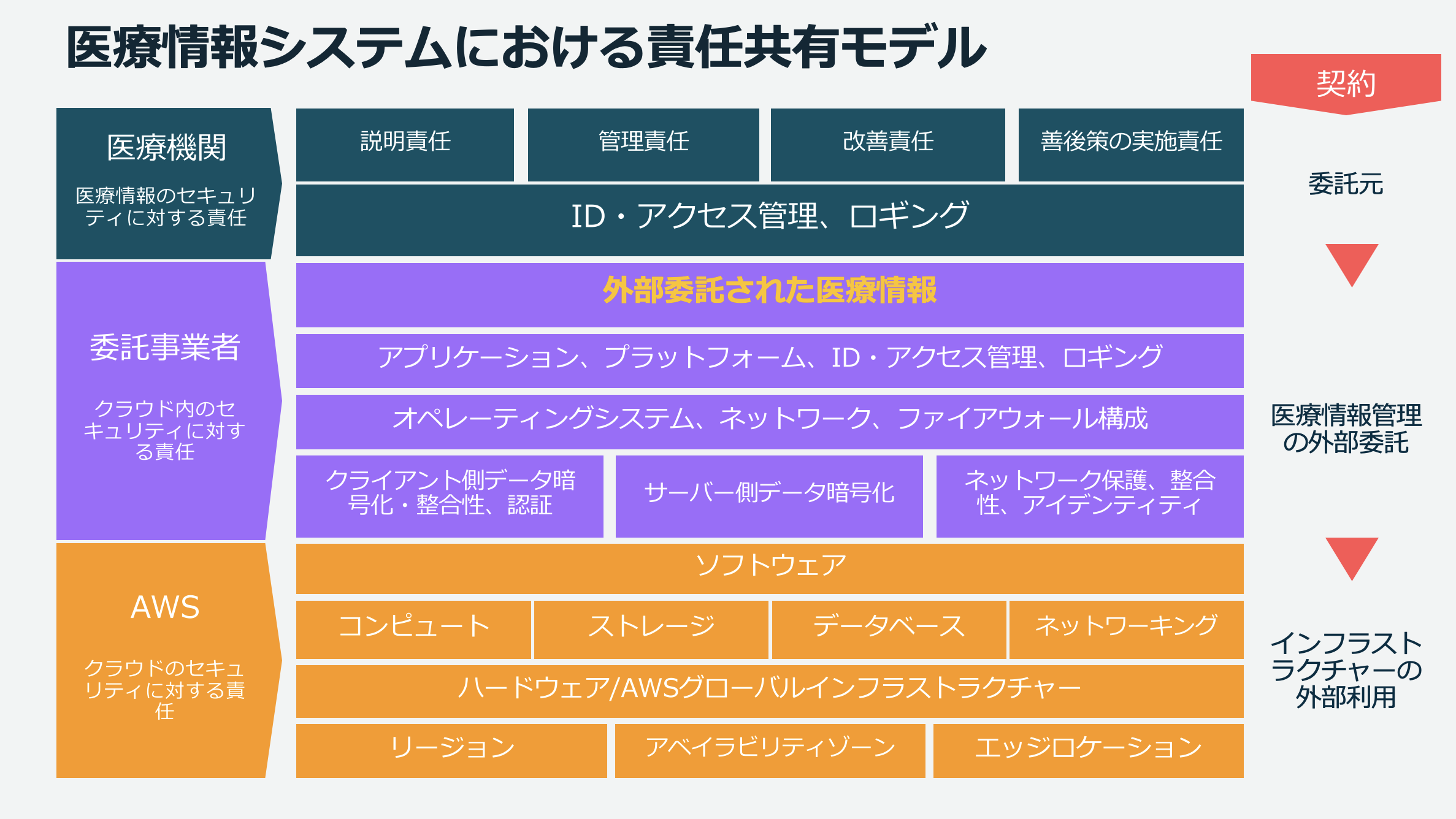 ここで、AWS は医療情報システムにおける 3 章 2 ガイドラインへ対応しているか? という質問を多くのお客様よりいただきます。AWS では責任共有モデルに従って、お客様や AWS パートナーの皆様の固有のシステム要件やアプリケーションの要求事項に見合う形で、どのように各種 AWS サービスをご活用いただけるかということを検討するための AWS サービスに関する情報をご提供しお客様ご自身にご判断いただいております。そのため AWS から一概に対応可否を回答しておりませんが、AWS パートナー各社作成の「医療情報システム向け AWS 利用リファレンス」を活用いただくことが可能です。