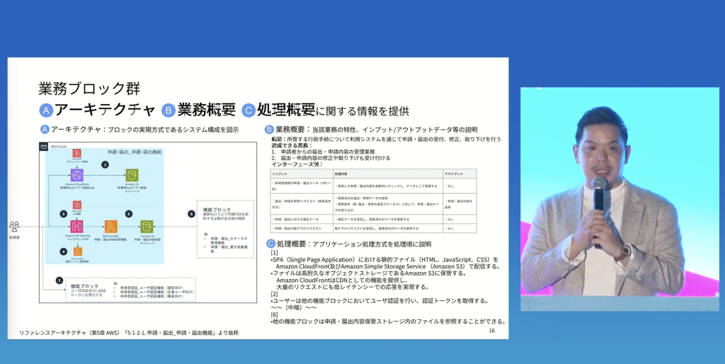 次に、西畑氏が登壇し、「デジタル庁は”動くリファレンスアーキテクチャ”の開発にも取り組んでおり、リファレンスアーキテクチャをベースにしたサンプルアプリケーションを IaC コードで提供することで、利用イメージの把握やシステム構築の支援を促進している」と伝えています。