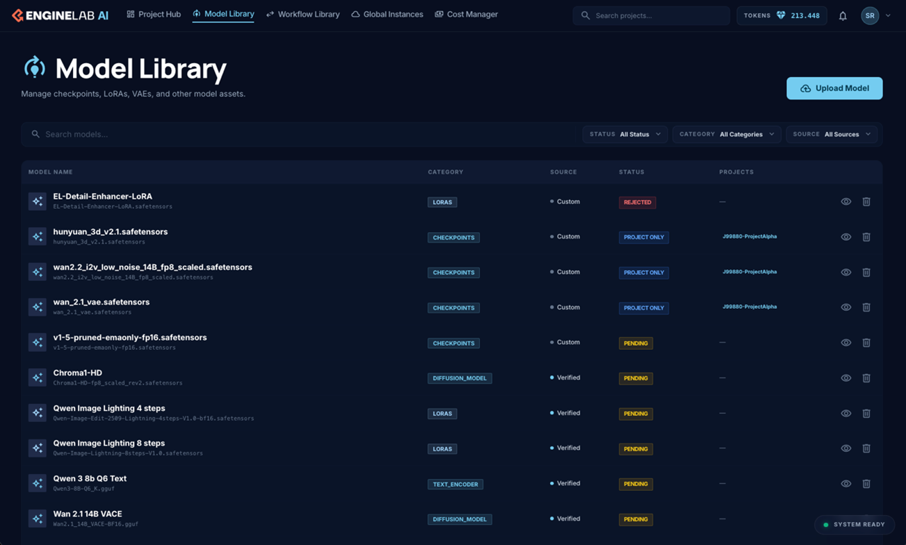 管理者は最小権限モデルによってプラットフォームをきめ細かく制御できます。ユーザーとリソースには各タスクの実行に必要な権限のみが付与され、上級ユーザーと管理者はモデルのアップロードと承認が可能な一方、一般ユーザーのアクセスは制限されます。ベンダー固有の承認もサポートしており、特定プロジェクトでは承認済みモデルのみを使用できます。これは厳格なコンプライアンス要件を持つクライアントと仕事をするスタジオにとって重要な要件です。包括的な監査証跡によりプロジェクトごとのモデル使用状況を追跡してクライアントへの報告やコンプライアンス検証に活用でき、プロベナンス追跡によってモデルの出所や組織全体での使用状況を正確に把握できます。