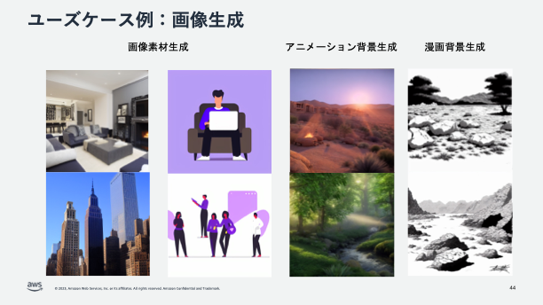 音声をテキストに変換する Amazon Transcribe と大規模言語モデルを組み合わせる事で実現できます。 - 画像素材の生成/編集: 記事の挿絵や、背景画、広告クリエイティブの自動生成、古いコンテンツのリマスター