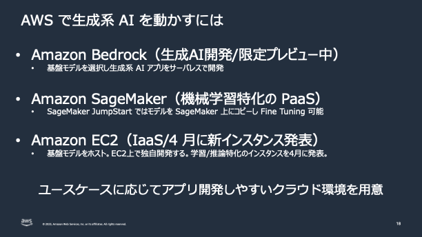Amazon Bedrock は、複数の基盤モデルをサーバーレスでお使い頂ける 2023 年 4 月に発表された新サービスです。お客様のユースケースに沿って AI21 Labs, Anthropic, Cohere, Stability AI, Amazon の基盤モデルを選択して頂けます。Amazon SageMaker は、機械学習に特化したプラットフォームです。Amazon SageMaker JumpStart では、事前に用意されている基盤モデルを数クリックでホスティングする事ができます。Amazon EC2 では生成 AI に必要な学習と推論に特化した最新インスタンスが先般発表されました。Amazon EC2 は基盤モデルを独自開発するためのリソースとしてお使い頂けますし、基盤モデルの推論のリソースとしてもお使い頂けます。