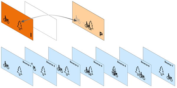 このフレーム内の各マクロブロックは、I マクロブロックまたは P マクロブロックとしてエンコードできます。I マクロブロックは I フレームの中のマクロブロックのようにエンコードされます。P マクロブロックは過去の参照画像の領域に誤差項(2 つのマクロブロックの間の違い)を加えたものとしてエンコードされます。そのため、変化しなかったピクセルは再作成されず、I フレームから参照されます(以下を参照)。