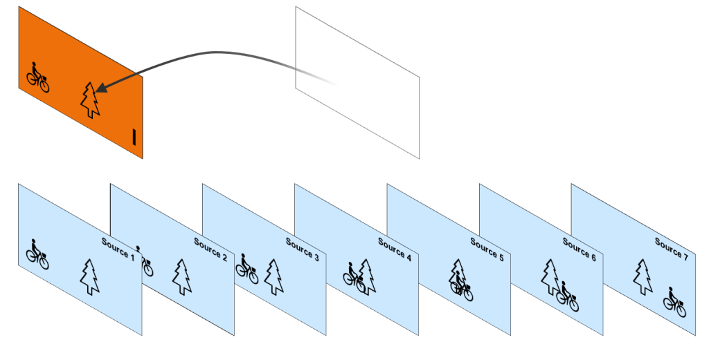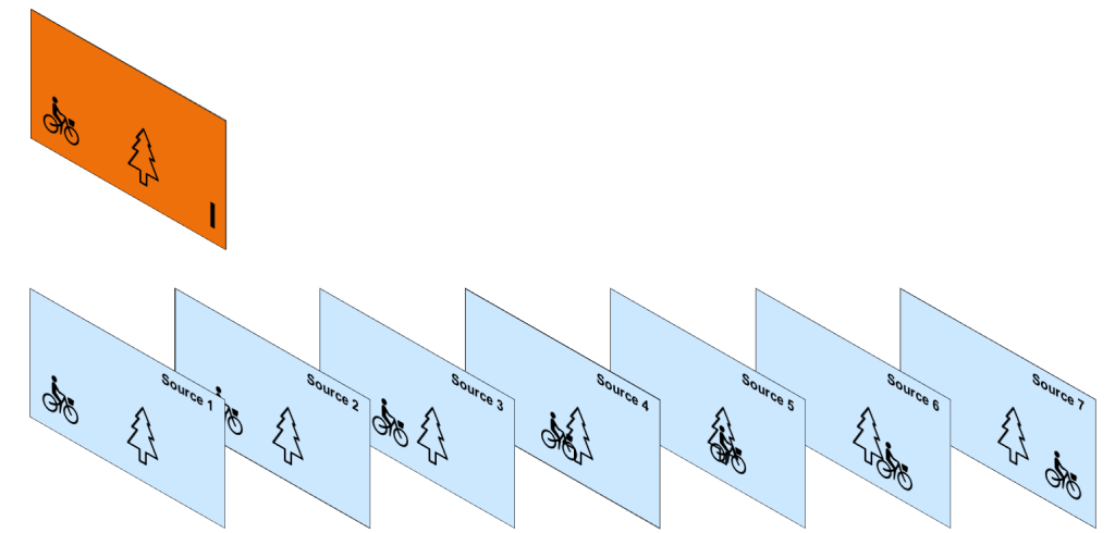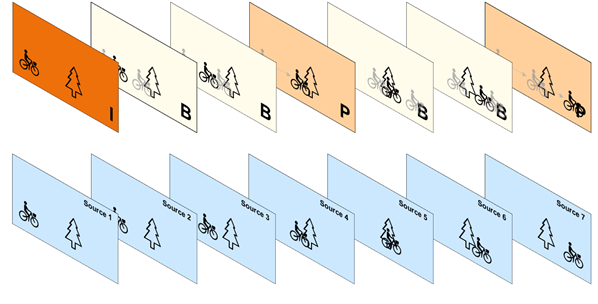 後続のフレームを見ると、冗長な情報がたくさんあることに気づくでしょう。例えば、木はすべてのフレームに常に存在しており、自転車はあるフレームから次のフレームへの移動として表現されます。動画に固有の時間冗長性をうまく利用するために、MPEG は予測フレーム(P フレーム)と双予測フレーム(B フレーム)と呼ばれる新しいタイプのフレームを定義しました。