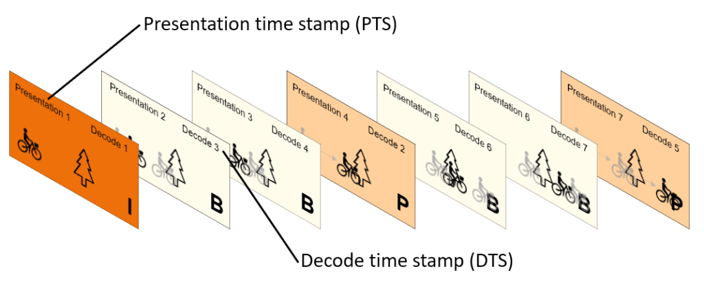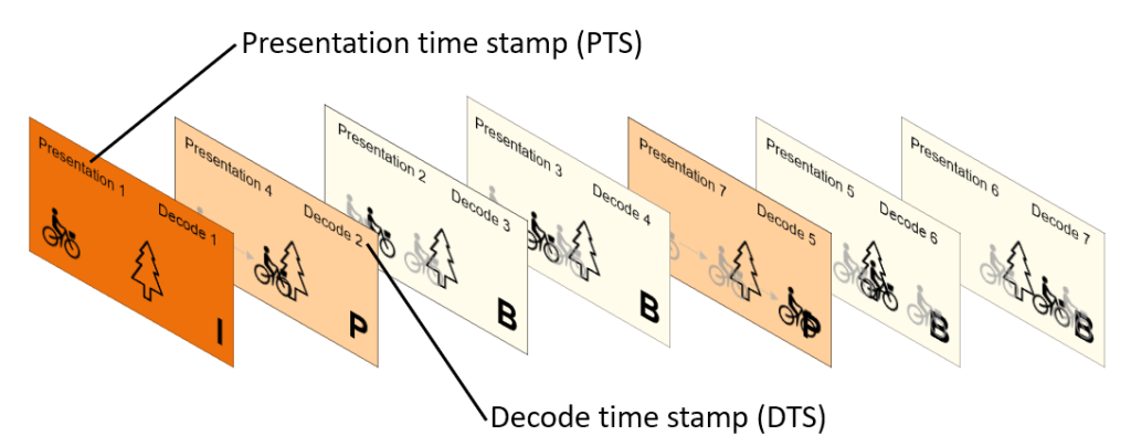 しかし、フレームはエンコードされた順番で再構築またはデコードされる必要があります。最初に I フレームが構築され、次に P フレームが構築されます。その次に、B フレームを構築できます。この順序の記録を付け、このデータを転送するために、デコードタイムスタンプが各フレームに割り当てられます。