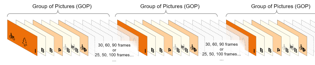 Group of Pictures(もしくは GOP 構造)は Intra フレームと Inter フレームが配置される順序を規定します。通常、I フレームは GOP の始まりを示します。