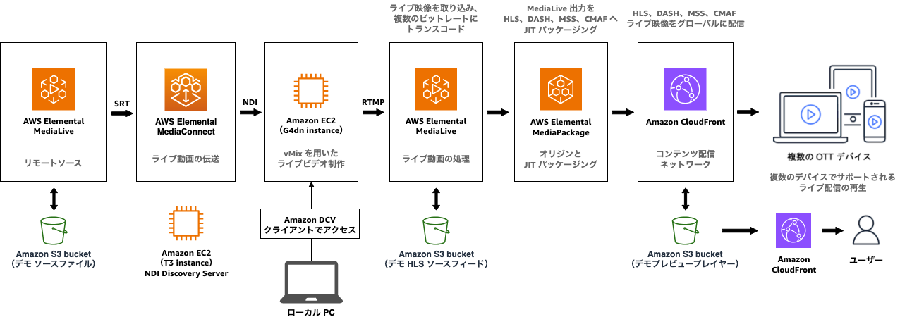 Amazon Elastic Compute Cloud (Amazon EC2) 上でライブミキシングスイッチャーソフトウェアの vMix を実行し、AWS Elemental Media Services または Amazon Interactive Video Service と連携させて、クラウドベースのライブプロダクションおよびライブストリーミング配信の実施を学べるワークショップです。2025 年 3 月に AWS Elemental MediaConnect で対応した NDI (Network Device Interface) 出力機能の設定も含まれております。