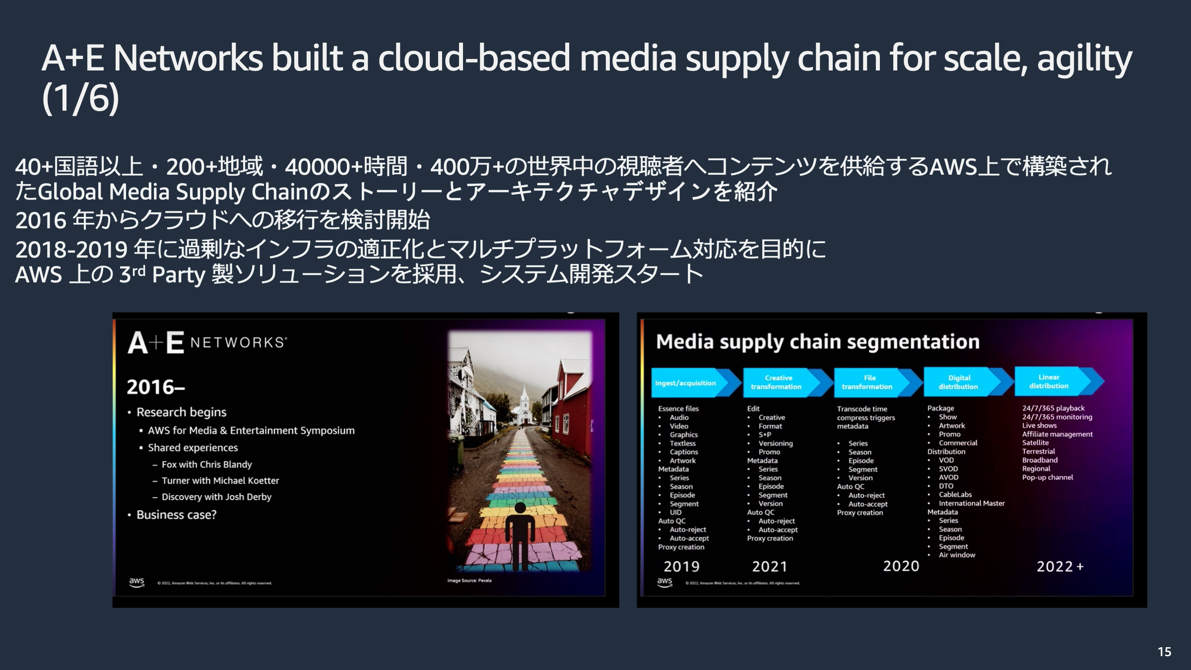 スケールとアジリティを実現するためにクラウドベースのメディアサプライチェーンを構築した A+E Networks の事例が紹介されました。既存インフラが EOL を迎えたことをきっかけに、インジェスト、パッケージ化、配信、アーカイブまでのワークフローを行う 3rd party solution である SDVI を用いてメディアサプライチェーンを開発されました。メディアのサプライチェーンには様々な処理が介在しており複雑で、それぞれの処理には待ちが発生するので、これらを解決するのにクラウド以外の選択肢はないと言及されていました。また、このセッションではメディアサプライチェーンを構築する方法や実際の構成と機能についても説明いただきました。