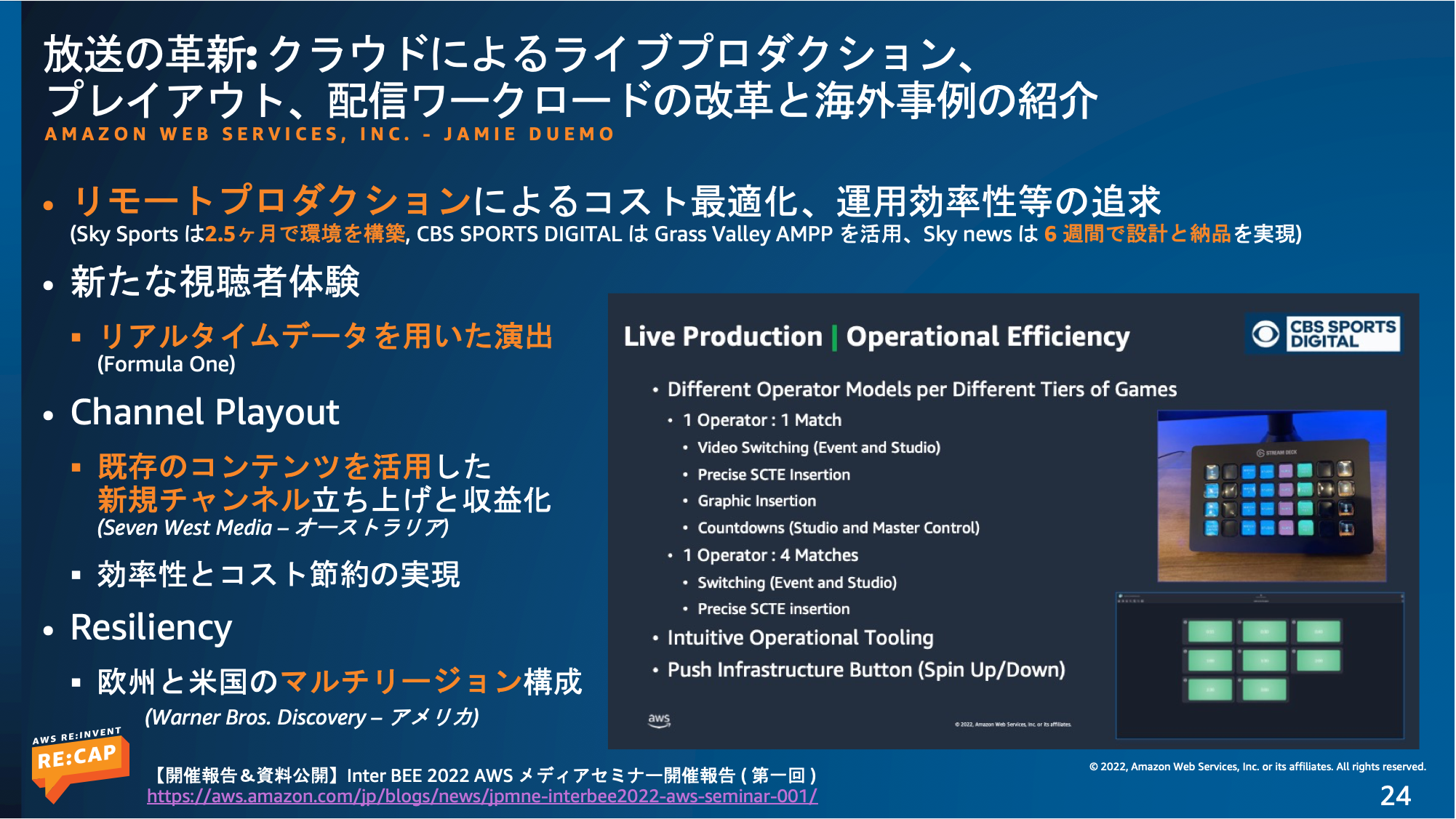 こちらのパートでは Inter BEE に出展した AWS ブースでの展示内容やブース内特別セッション、同時開催の AWS メディアセミナーにおける国内外ゲストによる最新事例を要約してご紹介しました。