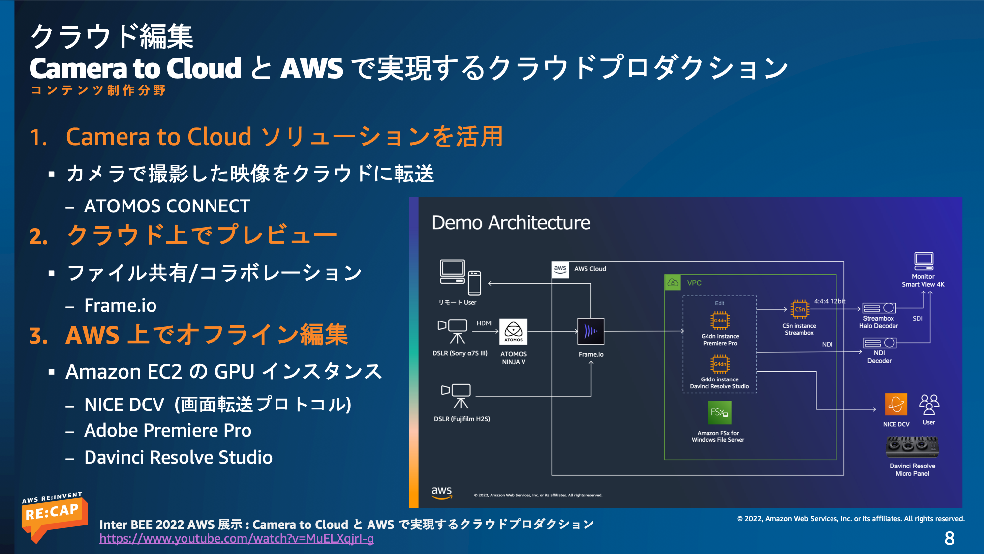 Camera to Cloud とクラウド編集という形でクラウドプロダクションの展示を行いました。具体的には ATOMOS CONNECT を始めとしたカメラからクラウドへ映像素材を直接アップロード可能なソリューションを展示しました。撮影が終了すると動画クリップが作成され、自動でクラウド上のコラボレーションツールへアップロードされるため、素材を遠隔地からも確認可能です。今回、ファイルの共有やコラボレーションには Frame.IO を用いました。アップロードされた素材は Amazon Elastic Compute Cloud (Amazon EC2) 上で動く Adobe Premiere Pro や Davinch Resolive Studio 等を用いることで、遠隔地から編集やグレーディング作業が可能です。