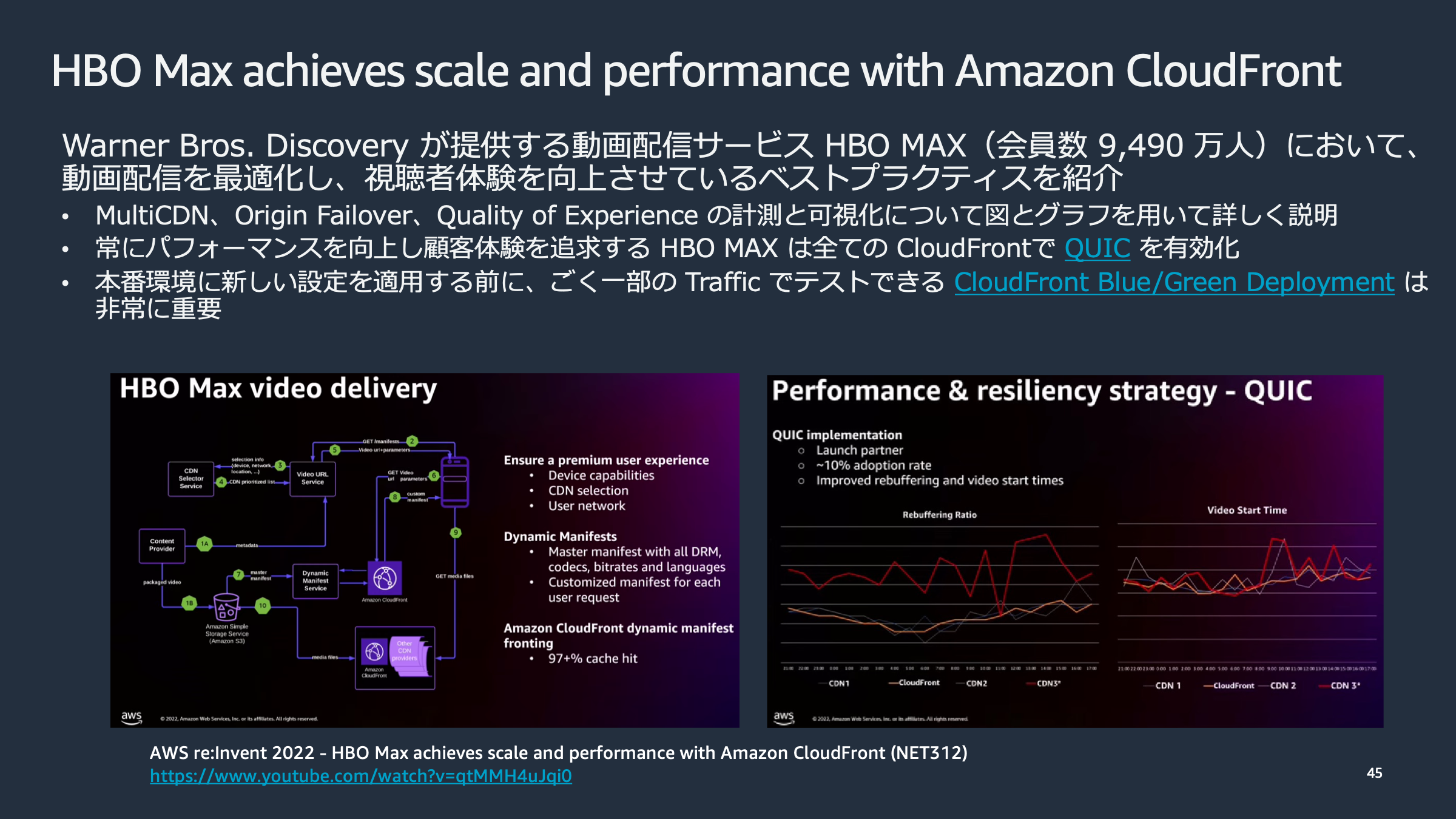 このセッションでは、Warner Bors. Discovery が提供する動画配信サービスである HBO MAX(会員数 9,490 万人)での動画配信の最適化と視聴者体験の向上を実現するベストプラクティスが紹介されました。MultiCDN、Origin Failover といったアーキテクチャや、Quality of Experience のメトリクスについて図を用いて詳細に説明いただきました。他にも、パフォーマンスを向上するために Amazon CloudFront で QUIC を有効化していることや、CloudFront Blue/Green Deployment を活用していること等、利用している CloudFront についてのポイントも説明いただきました。