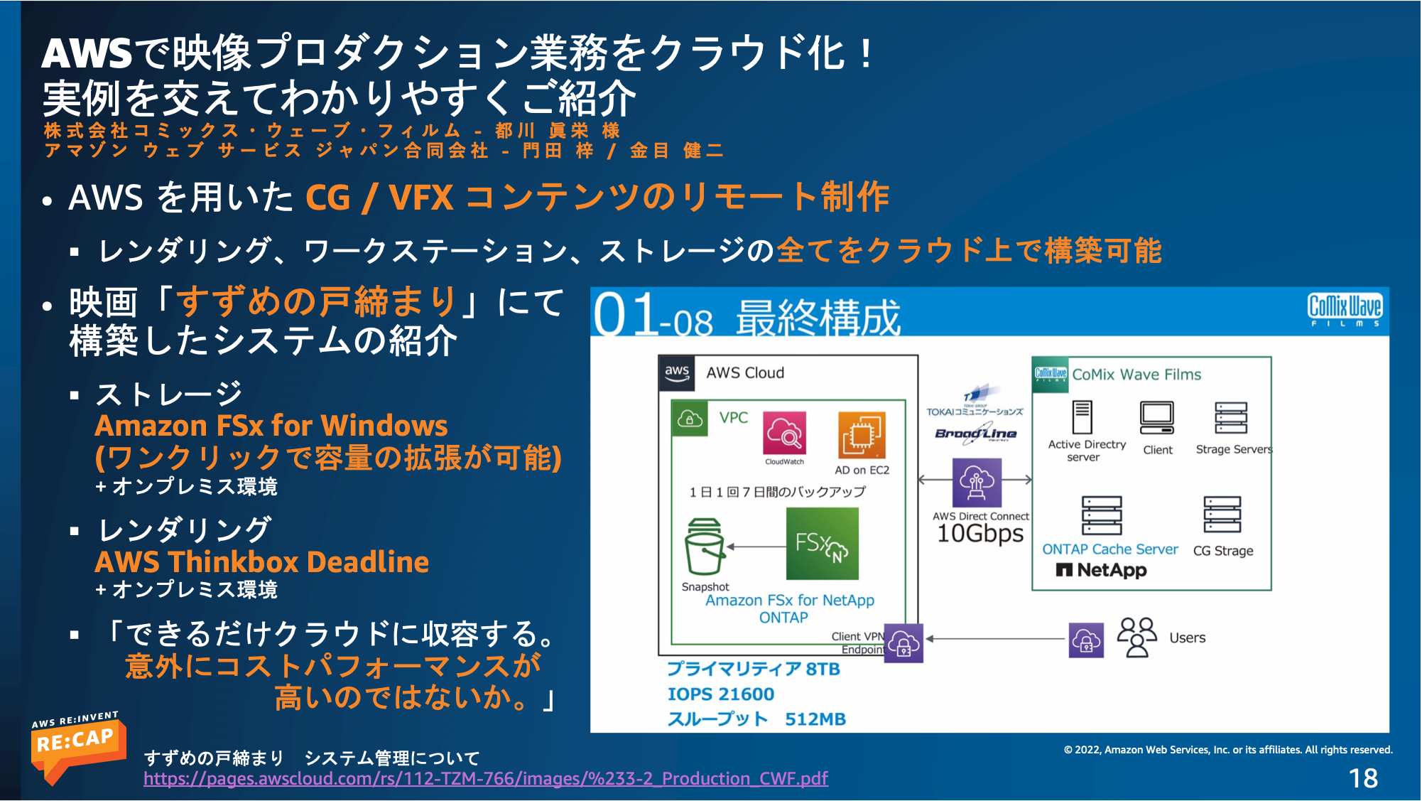 映画「すずめの戸締まり」の映像制作において、ストレージに Amazon FSx for Windows、レンダリングファームに AWS Thinkbox Deadline を採用いただいた経緯やその効果についてご紹介いただきました。セッションの中では、「できるだけクラウドに収容する。こういった構成にすることが、意外にもコストパフォーマンスが高いのではないか」とのご感想もいただきました。