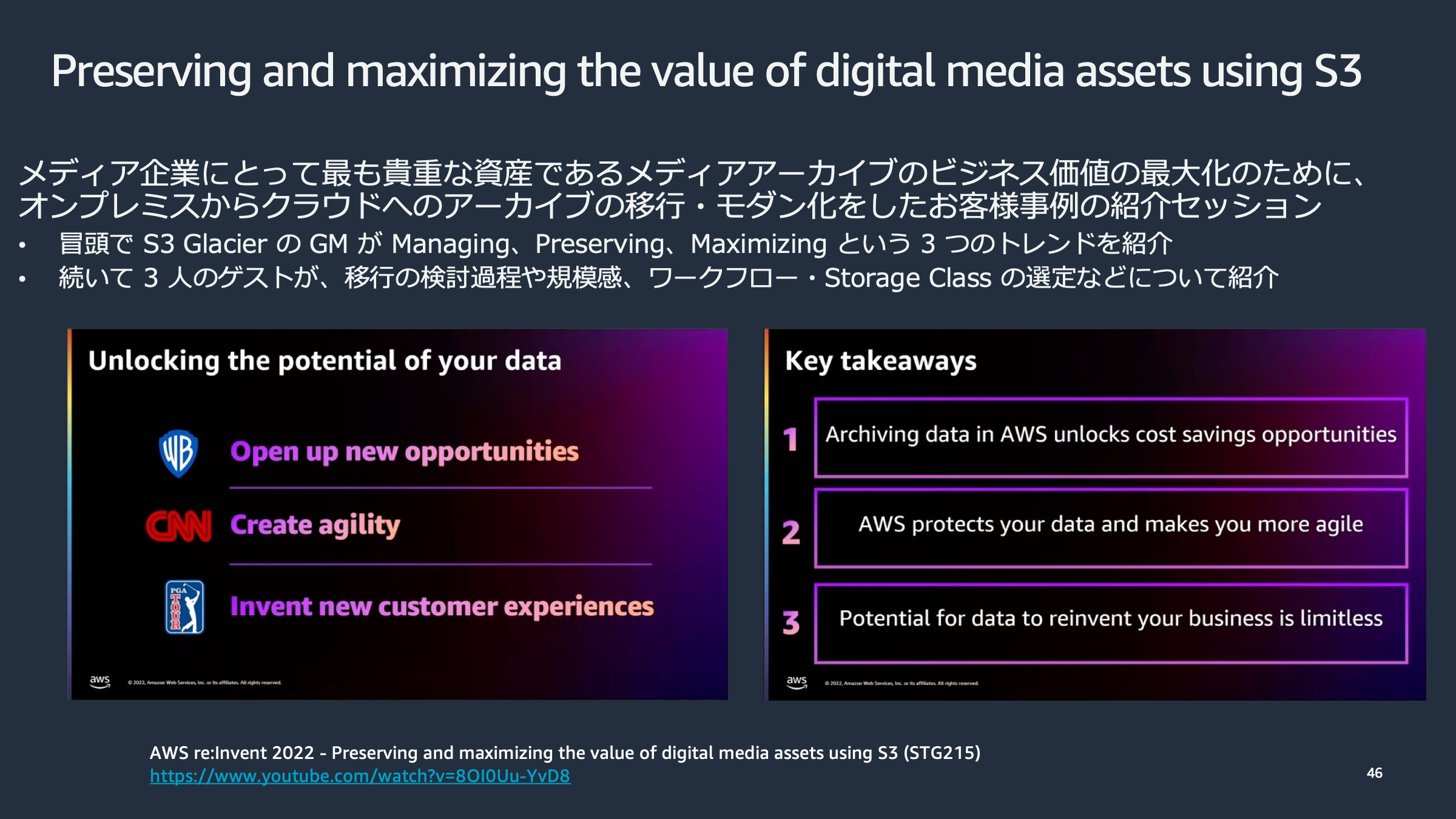 このセッションでは、メディア企業にとって最も価値のある資産であるメディアアーカイブのビジネス価値を最大化することを目的に、メディアアーカイブをクラウドに移行、モダナイズしたお客様の事例が紹介されました。初めは Amazon Simple Storage Service Glacier (Amazon S3 Glacier) の GM である Joe Fitzgerald より Managing、Preserving、Maximizing という 3 つのトレンドが紹介され、続いて 3 人のゲストより移行の検討過程や規模感、ワークフロー・Storage Class の選定等について説明いただきました。