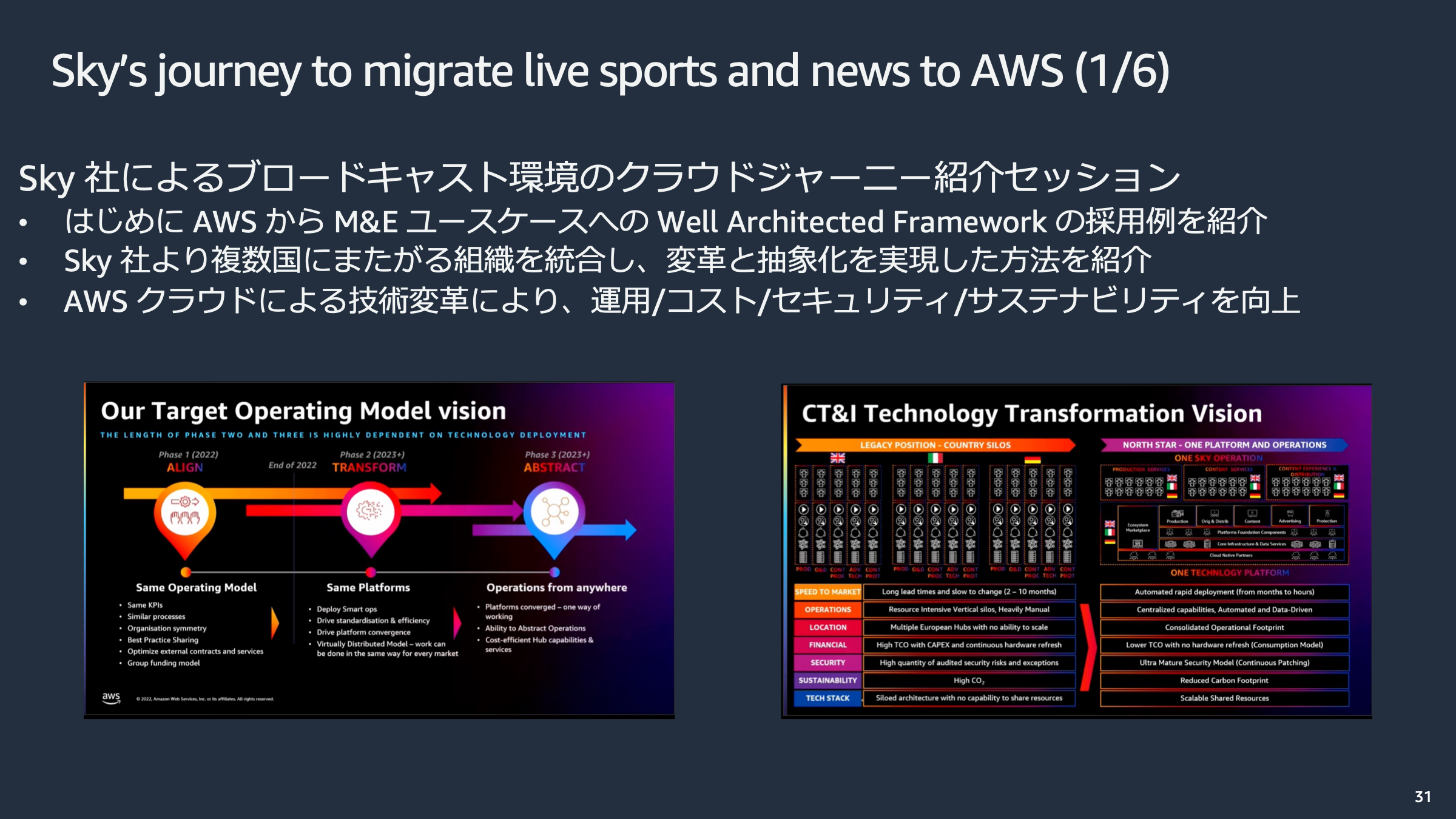 このセッションでは、ブロードキャスト環境のプロダクションからプレイアウト、配信までを AWS で再設計した Sky の道のりを紹介して頂いています。きっかけは2019 年、COVID-19 等の社会的イベントがあり、ビジネスに変革が必要になり、組織の設立や統合を実施し、目指すべきゴールやビジョンを設定されたそうです。そして現在はコンテンツサプライチェーンの全てがクラウド上にあり、500 のコンテンツパートナー、数百ペタバイトのストレージ、250,000 アセットを処理されているとのことです。セッションの中では、実際にクラウド移行したブロードキャスト環境のケーススタディを Cloud Production、Playout、Software Defined Encoding に分けてご紹介いただきました。