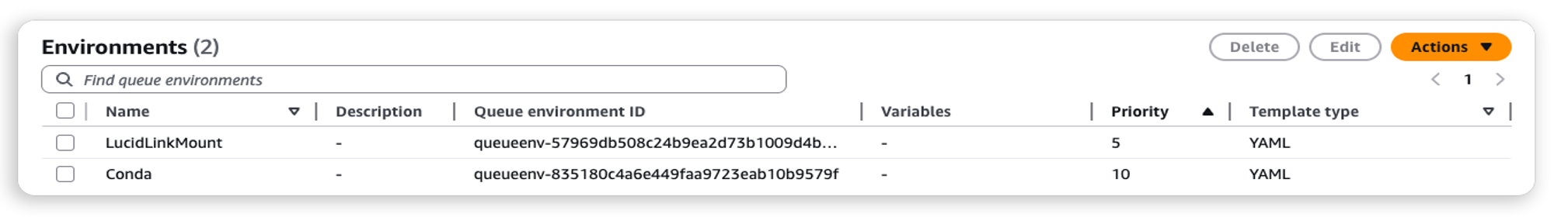 図 2. AWS Deadline Cloud のQueue Environmentsテーブル