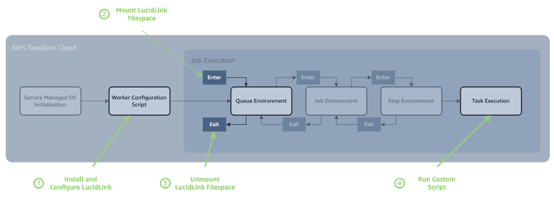 ② ジョブ実行前にレンダーノードに適切な LucidLink Filespace をマウント