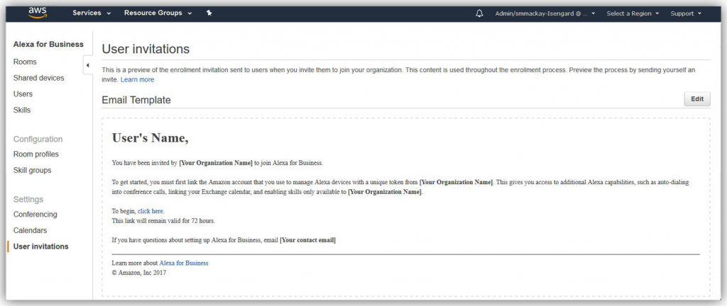 私のAlexa for Businessアカウントにユーザーを招待できるように、私の組織のユーザー招待状を設定することから始めます。ユーザーが組織内でAlexa for Businessを使用できるようにするには、管理コンソールから電子メールでユーザーの招待状を送信して、自分のAlexaアカウントにサービスを登録するよう招待します。私が選択すると、ユーザーの登録メールをカスタマイズして、追加のコンテンツを含めることができます。たとえば、組織のAlexaスキルに関する情報を追加できます。スキルは、招待を受け入れて登録プロセスを完了した後に有効にすることができます。私のユーザは、会議通話への自動ダイヤル、Microsoft Exchangeカレンダーのリンク、プライベートスキルの使用など、Alexa for Businessの機能を使用するために参加する必要があります。