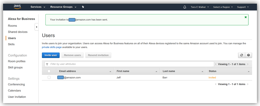 ユーザー招待状をカスタマイズしたので、ダッシュボードの[ユーザー]メニューに移動して電子メールアドレスを入力することで、自分の組織のAlexa for Businessを利用するようにユーザーを招待します。これにより、私の組織に参加するためのリンクが記載されたメールが送信されます。ユーザーは、自分のAlexaデバイスが登録されているAmazonアカウントを使用して参加します。 Jeff Barrを私のAlexa for Business