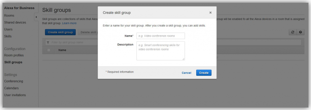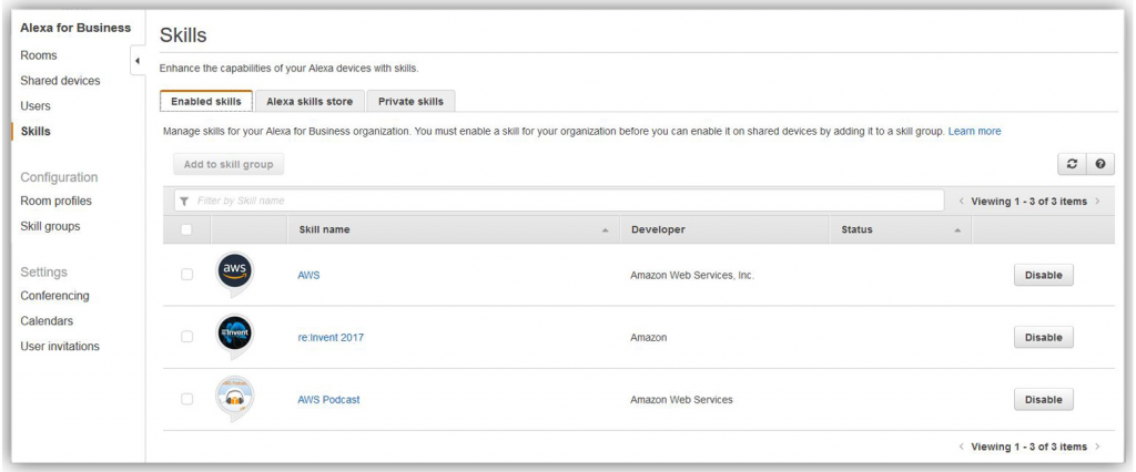 次のステップは、設定したデバイスのスキルを有効にすることです。私はAlexa Skills Storeのスキルを有効にするか、プライベートスキル 機能を使用して自分自身で構築し、Alexa for Businessアカウントで利用できるようにすることができます。共有デバイスのスキルを有効にするには、スキルメニューオプションにアクセスし、スキルを有効にします。スキルを有効にしたら、それらをスキルグループに追加して、スキルグループを自分の部屋に割り当てることができます。