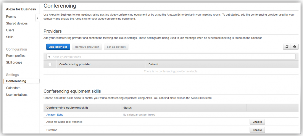 ビジネスのためのAlexaについて私が本当に好きなものは、Alexaを使って電話会議にダイヤルすることです。これを有効にするには、[会議]メニューオプションに行き、[プロバイダーの追加]を選択します。 AmazonではAmazon Chimeを使用していますが、異なるプロバイダのリストから選択することもできますし、必要に応じて独自のプロバイダを追加することもできます。