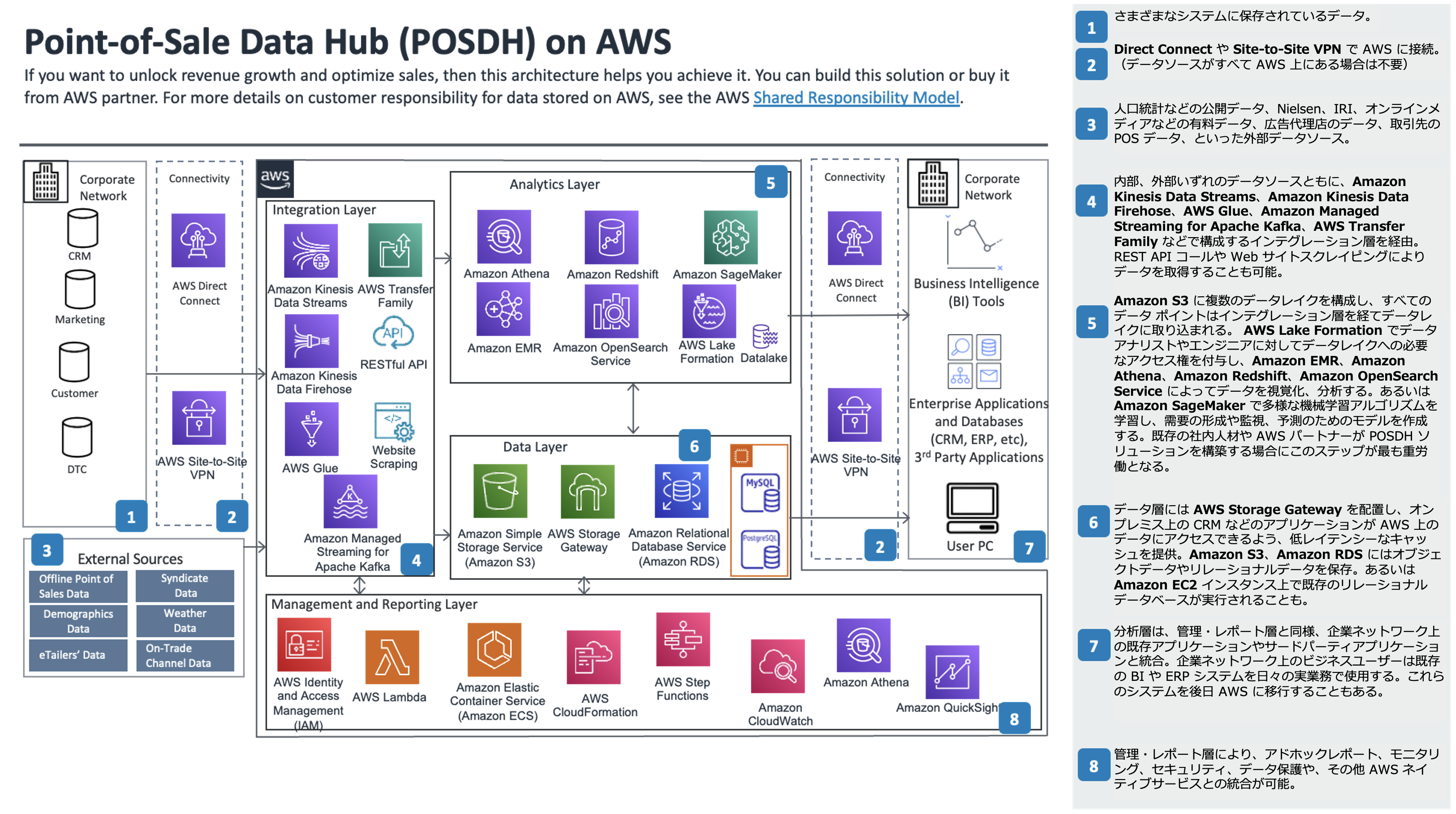 Sigmoid は AWS チームと協力し、データの取り込みから蓄積、分析、ダッシュボード、レポート、さらに管理レイヤーまで幅広く含む POSDH のリファレンスアーキテクチャを作成しました。図 1 に典型的な POSDH のリファレンスアーキテクチャを示します。