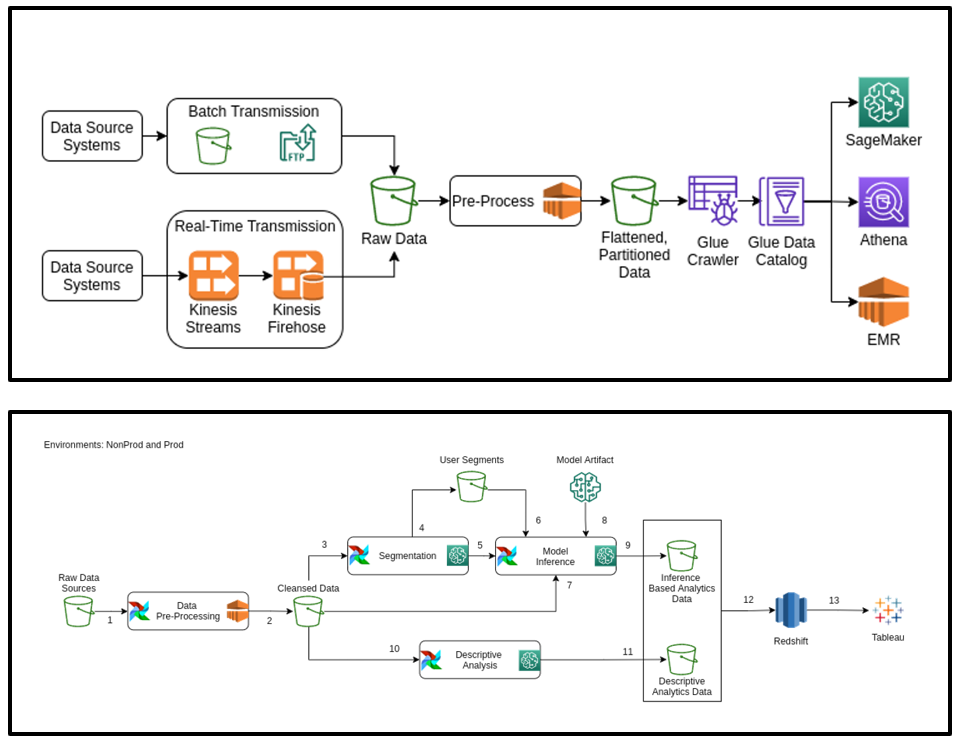 このソリューションによって、特定の属性を持つさまざまな消費者セグメントを識別できるようになりました。Sigmoid は次のような AWS のアナリティクスサービス、および機械学習(ML)サービスを使用しています。