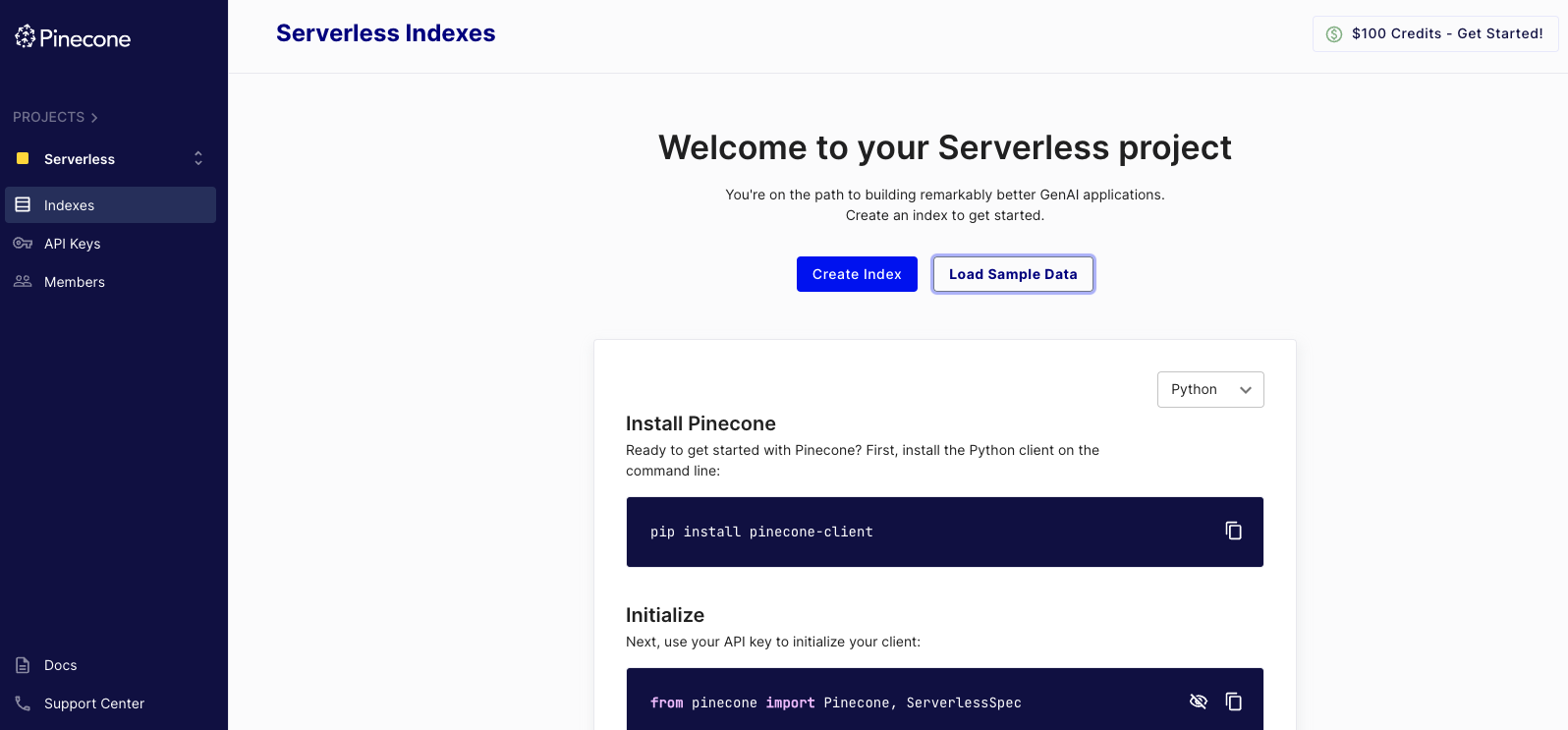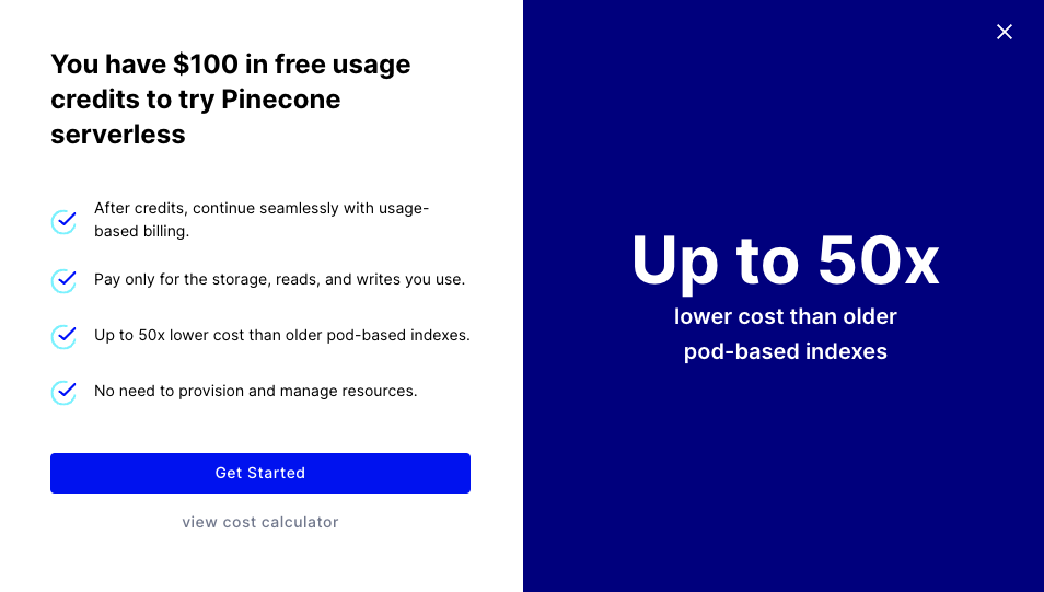 ユーザー登録が完了すると Pinecone のダッシュボードが表示されます。本稿の執筆時点 (2024年3月5日) では、Pinecone serverless の試用に関して 100 ドルのクレジットが提供されており、その旨を知らせるウィンドウが表示されます。