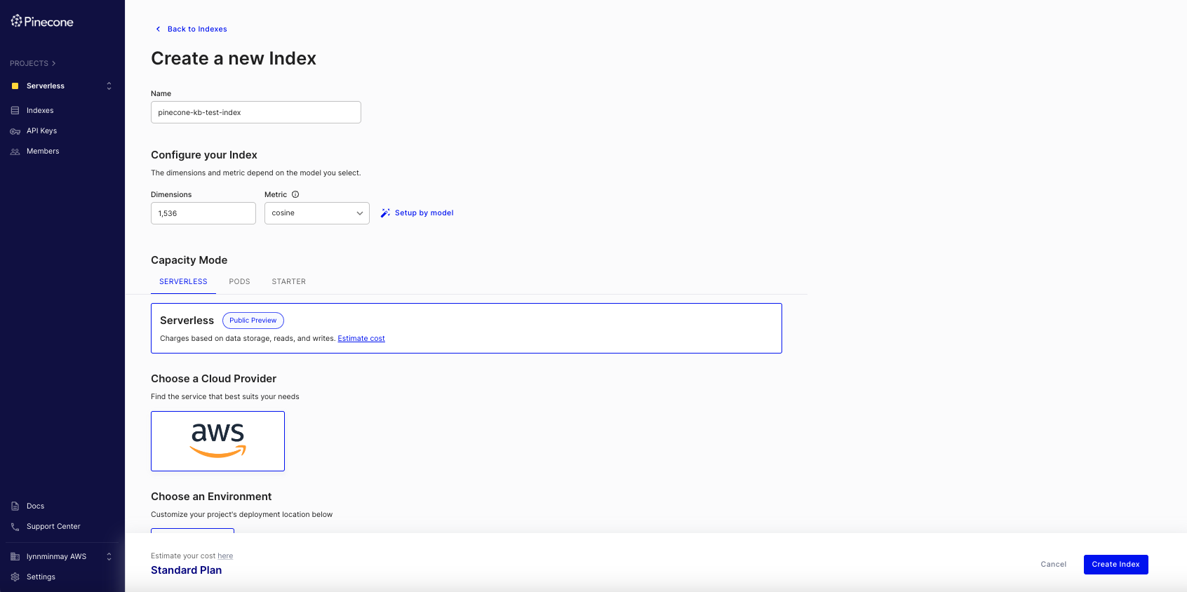 本稿執筆時点では、Pinecone には、フリートライアルの Starter プランと、pod と呼ばれるクラウドリソース (vCPU、RAM、disk) をあらかじめ用意する pod ベースの Standard プラン、Enterprise プラン、そして、あらかじめクラウドリソースを用意せず使用量に基づいて課金される Serverless プラン (プレビュー) があります。Starter、Standard、Enterprise プランについてはこちらのドキュメントをご参照ください。Serverless プランについては、こちらをご参照ください。