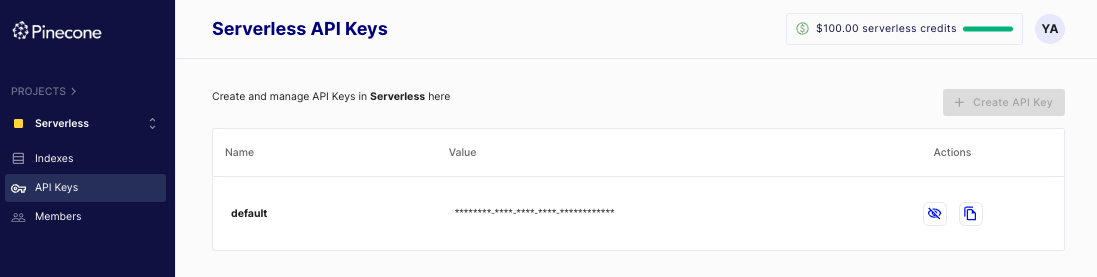 Pinecone のコンソールの左側ナビゲーションペインで “API Keys” をクリックします。右側の “Actions” にあるコピーアイコンをクリックして、API Key をクリップボードにコピーします。