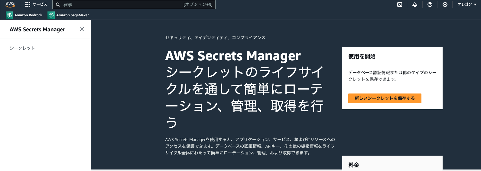 AWS マネジメントコンソールを開いているタブに戻り、上部の検索バーに “Secrets Manager” などと入力して AWS Secrets Manager のコンソールを開き、“新しいシークレットを保存する” をクリックします。