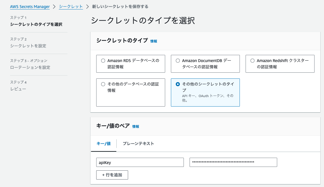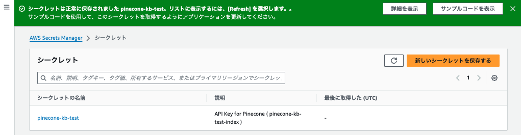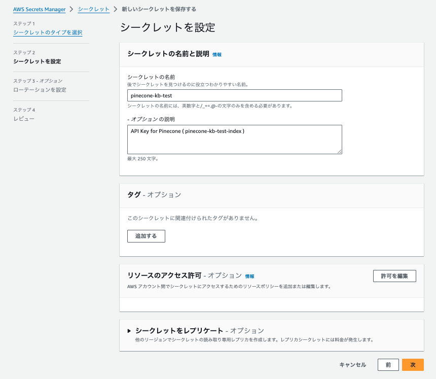 “シークレットの名前” (pinecone-kb-test など) と“オプションの説明” を入力して、右下の “次” をクリックします。次に表示される “ローテーションを設定 – オプション” は必要に応じて適切に設定し、右下の “次” をクリックします。“レビュー” 画面の内容を確認し “保存” をクリックします。