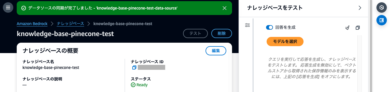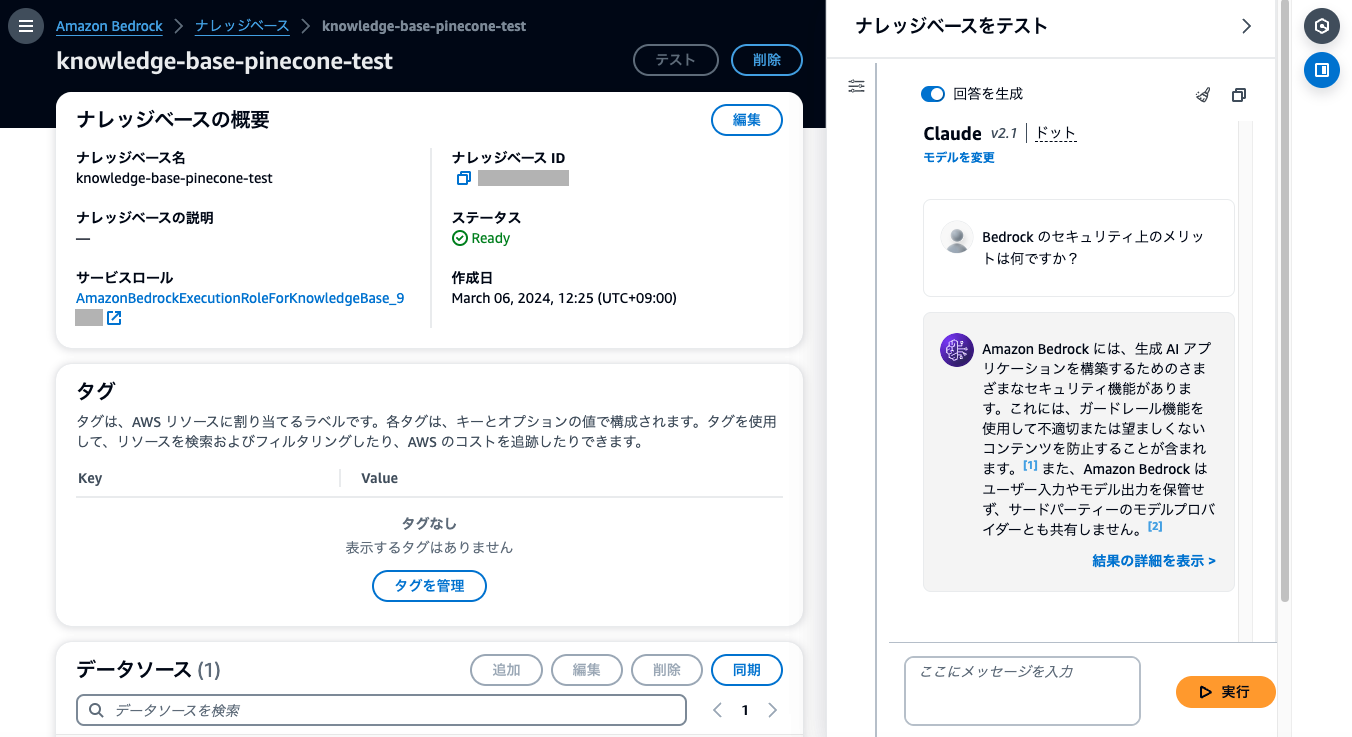 なお、この画面から移動してしまった場合は、Amazon Bedrock コンソールの左側ハンバーガーメニュー → ナビゲーションメニュー → オーケストレーション → ナレッジベースの順に辿り、テストしたいナレッジベースの名前を選択すると、同様の画面に遷移します。データストアに変更 (データの追加、更新、削除) があった場合には改めて ”同期“ を行う必要があります。API を使って同期する方法についてはドキュメントをご参照ください。