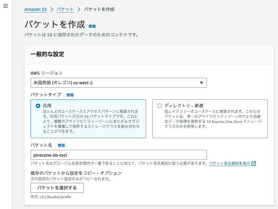 Knowledge base for Amazon Bedrock では、Amazon S3 をデータソースとして、S3 バケットにアップロードされたファイルをベクトルデータベースへ取り込みます。ナレッジベースを作成する前にデータソースとなる S3 バケットを作成し、ファイルをアップロードします。AWS マネジメントコンソールの上部の検索バーに “S3” などと入力して S3 のコンソールを開きます。右側の “バケットを作成” をクリックします。“バケットを作成”の画面が表示されたら “AWS リージョン” を選択 (本稿では、us-west-2 オレゴン) し、“バケット名” を入力して、右下の “バケットを作成” をクリックします。