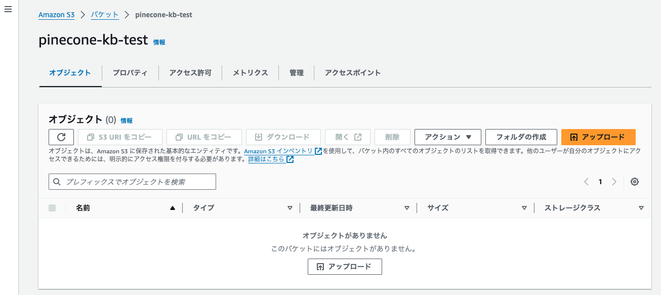 バケットの作成が完了したら作成したバケット名をクリックすると下図のような画面が表示されます。右側の “アップロード” をクリックします。