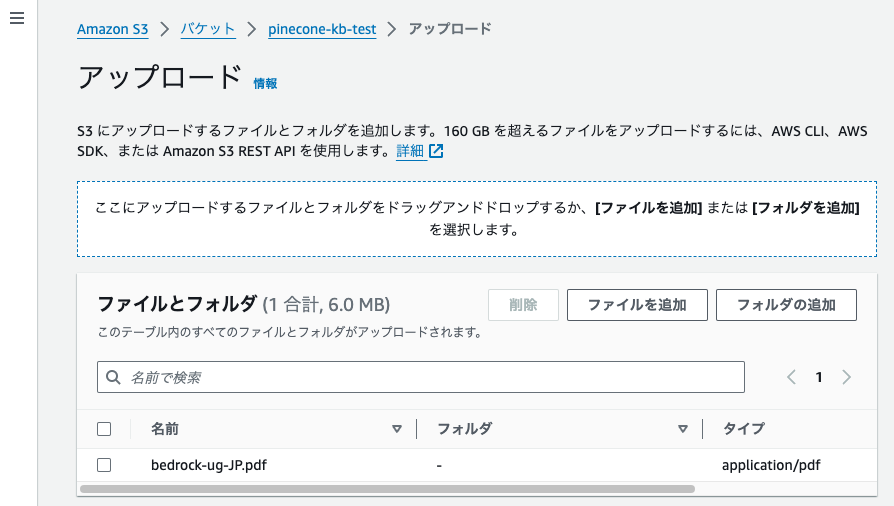 “ファイルを追加” をクリックして、ナレッジベースに登録するファイルを指定します。本稿では、Amazon Bedrock のユーザーガイドの PDF ファイルをアップロードします。