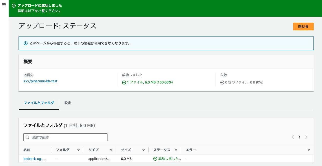 右下の “アップロード” をクリックします。アップロードに成功すると、下図のような画面が表示されます。概要欄に表示されている “送信先” (s3://...) をメモしておきます。右上の “閉じる” をクリックします。