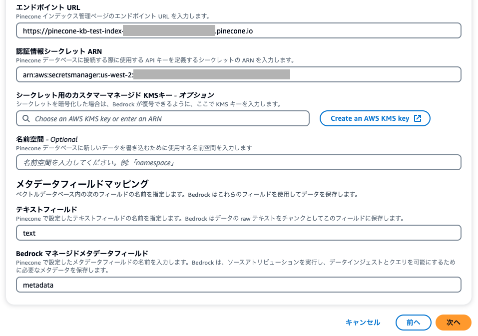 さらにスクロールダウンし、“エンドポイント URL” に “Pinecone の Index を作成する” のセクションの最後にメモした “HOST” の URL を入力します。また、“認証情報シークレット ARN” には、“Pinecone API Key を AWS Secrets Manager へ登録する” でメモした “シークレットの ARN” を入力します。“テキストフィールド” には、チャンクに分割されたテキストデータを保存する Pinecone のフィールド名 (text など) を入力します。“Bedrock マネージドメタデータフィールド” には、Bedrock がメタデータを保存する Pinecone のフィールド名 (metadata など) を入力します。“次へ” をクリックします。“確認して作成” 画面で入力内容を確認して、右下の “ナレッジベースを作成” をクリックします。
