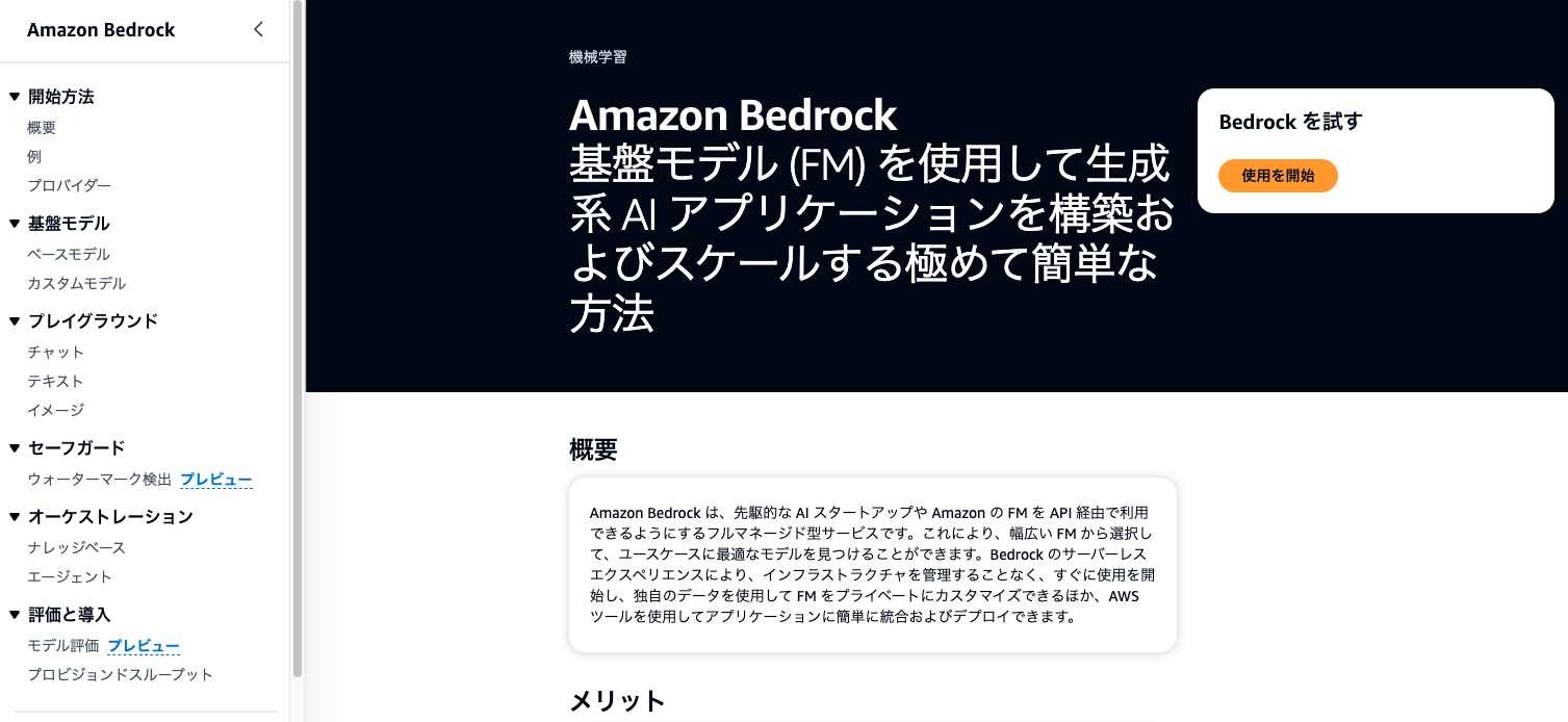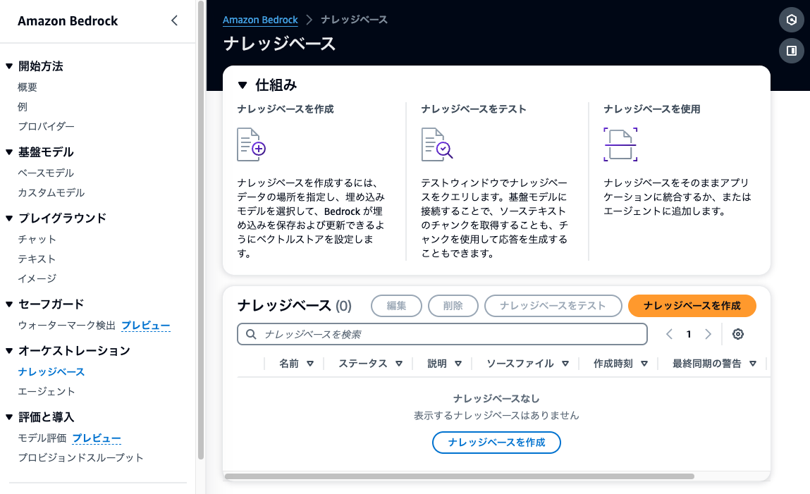 AWS マネジメントコンソールの上部の検索バーに “Bedrock” などと入力して、Amazon Bedrock のコンソールを開きます。左上のハンバーガーメニューをクリックしてナビゲーションペインを開き、“▼オーケストレーション” の下の “ナレッジベース” をクリックします。