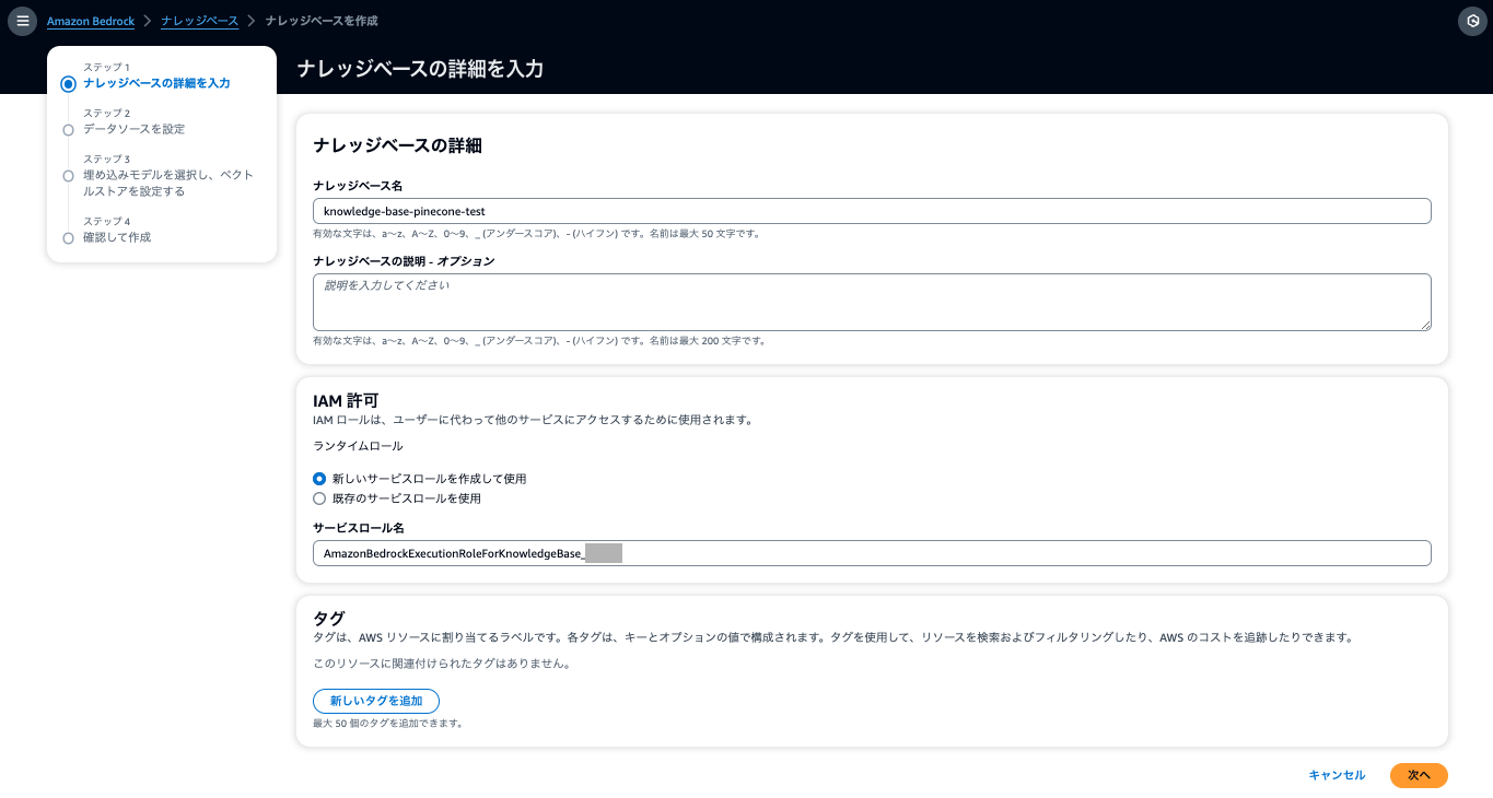 ステップ 1 の “ナレッジベースの詳細を入力” 画面で “ナレッジベース名” (knowledge-base-pinecone-test など) を入力して、右下の “次へ” をクリックします。