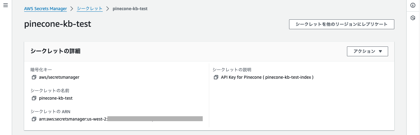 作成したシークレットをクリックして、“シークレットの詳細” を表示し、 “シークレットの ARN” をメモします。ナレッジベースが参照するベクトルデータベースを指定する際に必要となります。