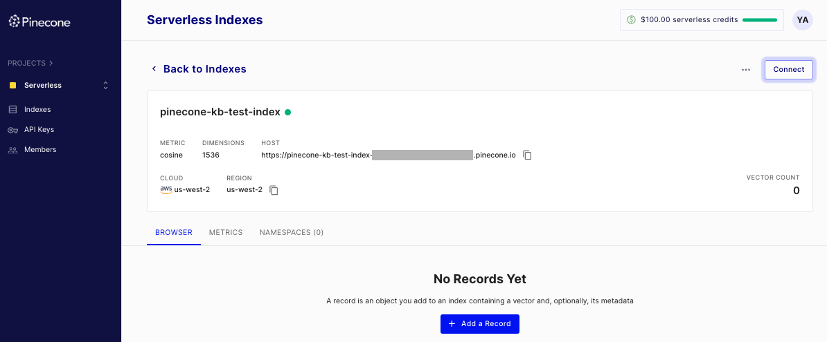 Pinecone Index の作成が完了すると下図のような画面が表示されます。通常、数秒から数十秒程度で完了します。