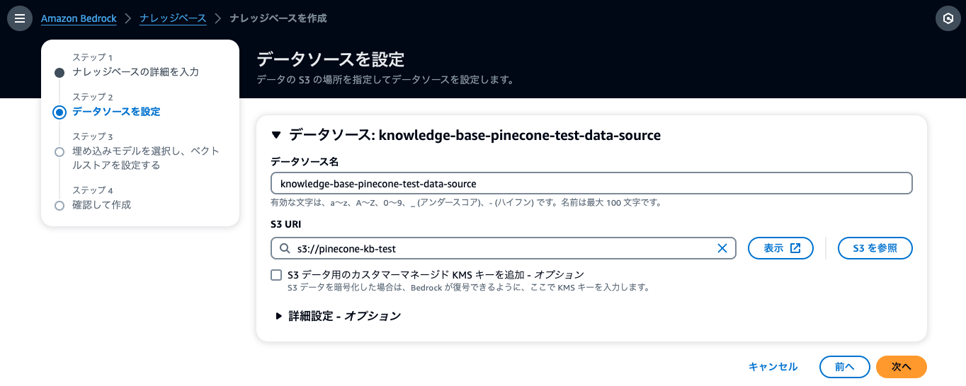 ステップ 2 の “データソースを設定” 画面で “データソース名” (knowledge-base-pincone-test-data-source など) と “S3 URI” を入力します。“S3 URI” には先ほどの “データソースを準備する” のセクションでメモした S3 URI を指定します (もしくは、 “S3 を参照” をクリックして選択します)。“次へ” をクリックします。