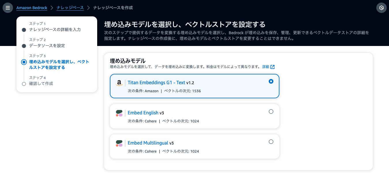 ステップ 3 では “埋め込みモデル” を選択します。本稿では、“Titan Embeddings G1 – Text” を使用します。他の埋め込みモデルを使用する際には、埋め込みモデルの “ベクトルの次元” と Pinecone Index の “Dimension” が一致している必要があることに注意してください。