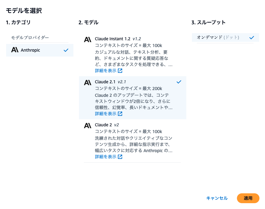 “モデルを選択“ 画面で、回答生成に使用したい基盤モデルを選択します。本稿では、Anthropic 社の ”Claude 2.1 v.2.1“ を選択します。Amazon Bedrock では Claude 3 が既に利用可能となっていますが、本稿執筆時点では Knowledge base for Amazon Bedrock で利用可能な基盤モデルは下図の 3 モデルとなっています。”適用“ をクリックします。