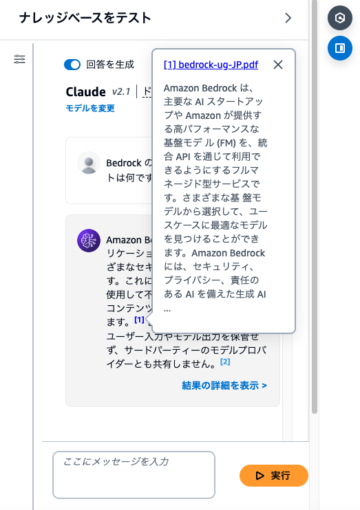 ナレッジベースの検索結果を元に、基盤モデルによる回答が生成されました。