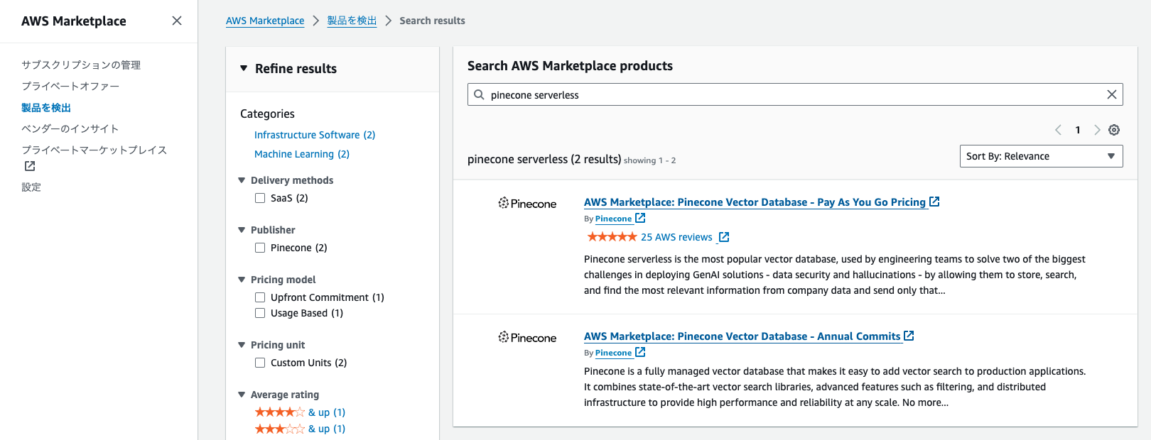 左ペインの “製品を検出” を開くと、下図のようなカタログの UI が表示されます。右上の検索バーに “Pinecone serverless” などと入力して、”AWS Marketplace: Pinecone Vector Database – Pay As You Go Pricing” をクリックすると Pinecone の製品ページが開きます