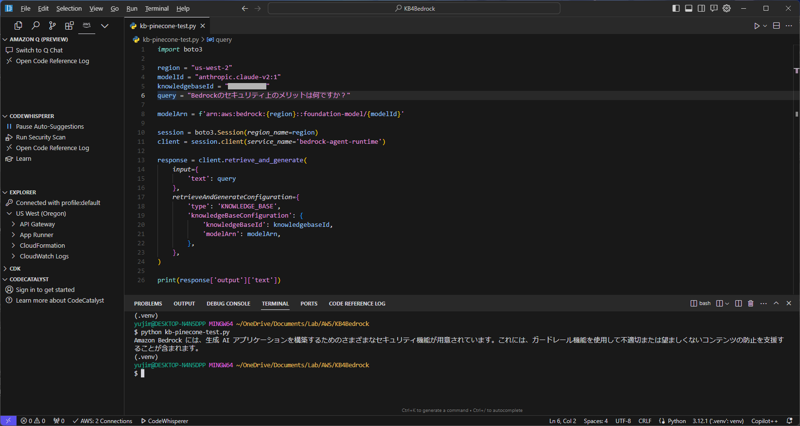 下記のコードサンプルの modelId と knowledgebaseId を、確認した値に修正し、必要に応じて query を修正します。