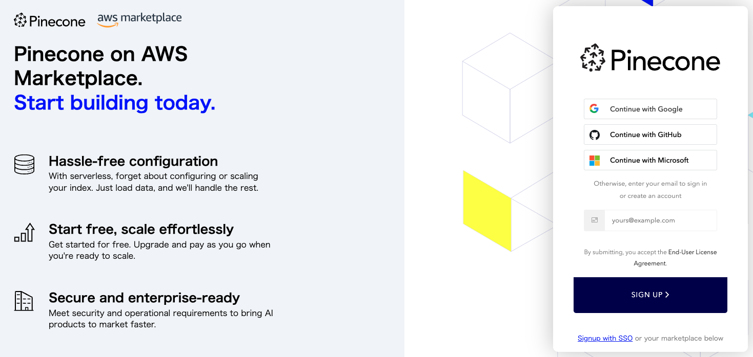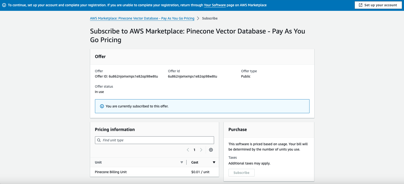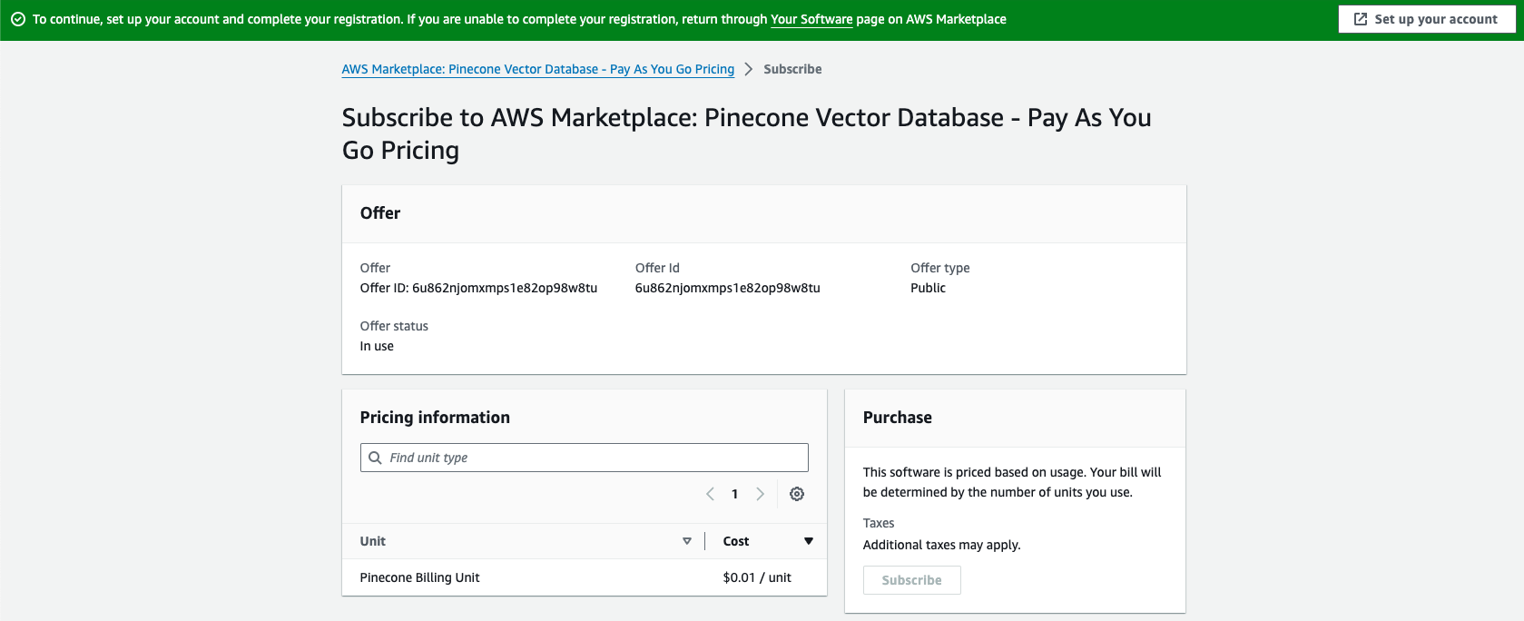 AWS Marketplace で Pinecone serverless をサブスクライブする